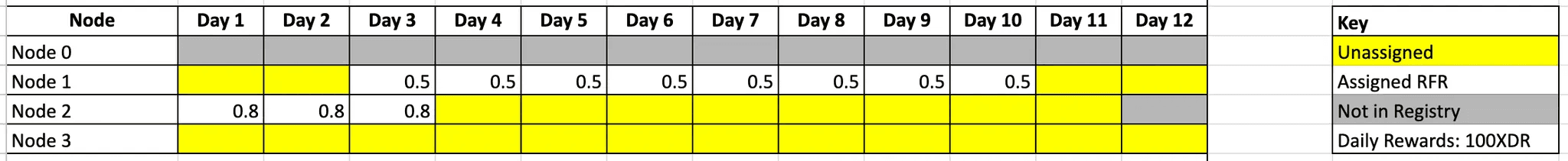 Assume a node provider has three nodes, each with a base reward of 100 XDR per day, over a 12-day reward period.