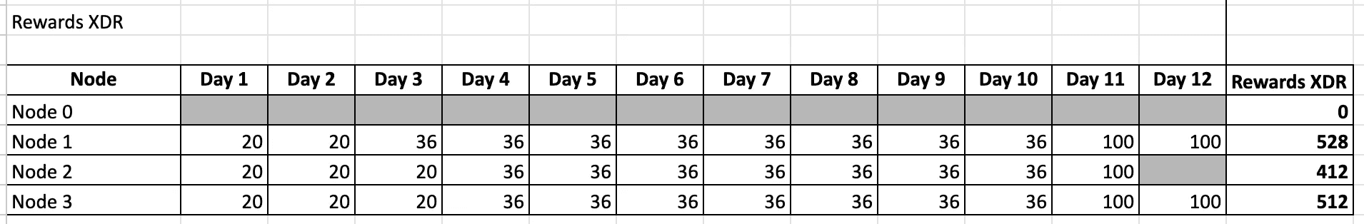 Multiply the performance multiplier by the base reward (100 XDR), and you get the final daily payout per node.